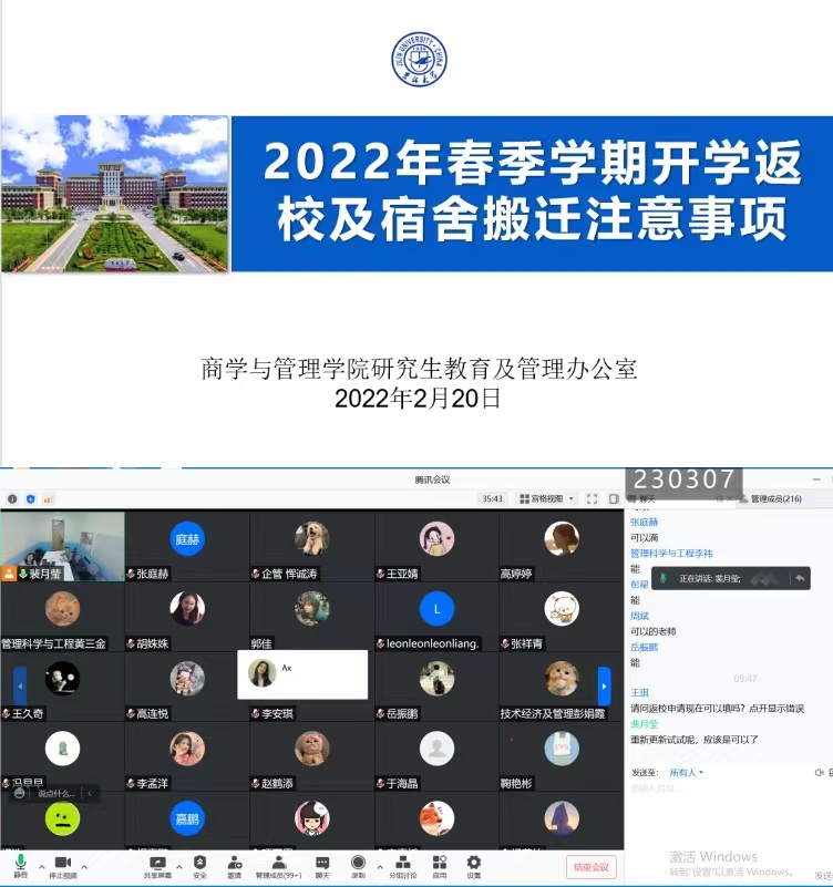 为了进一步明确春季学期特殊批次研究生返校工作和研究生公寓搬迁工作安排,qmh球盟会亚博网址于2022年2月20日上午召开线上研究生管理工作会议,参加会议的有学院党委副书记马腾老师、研究生辅导员裴月莹老师和全体涉及公寓搬迁工作研究生,会议由裴月莹老师主持。