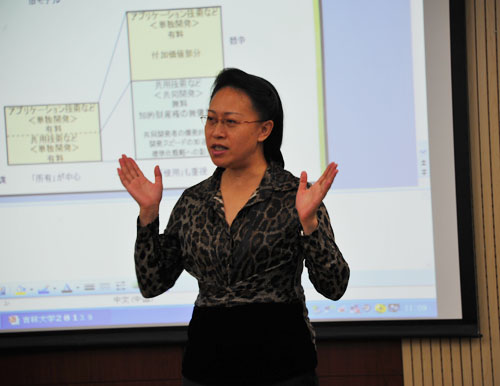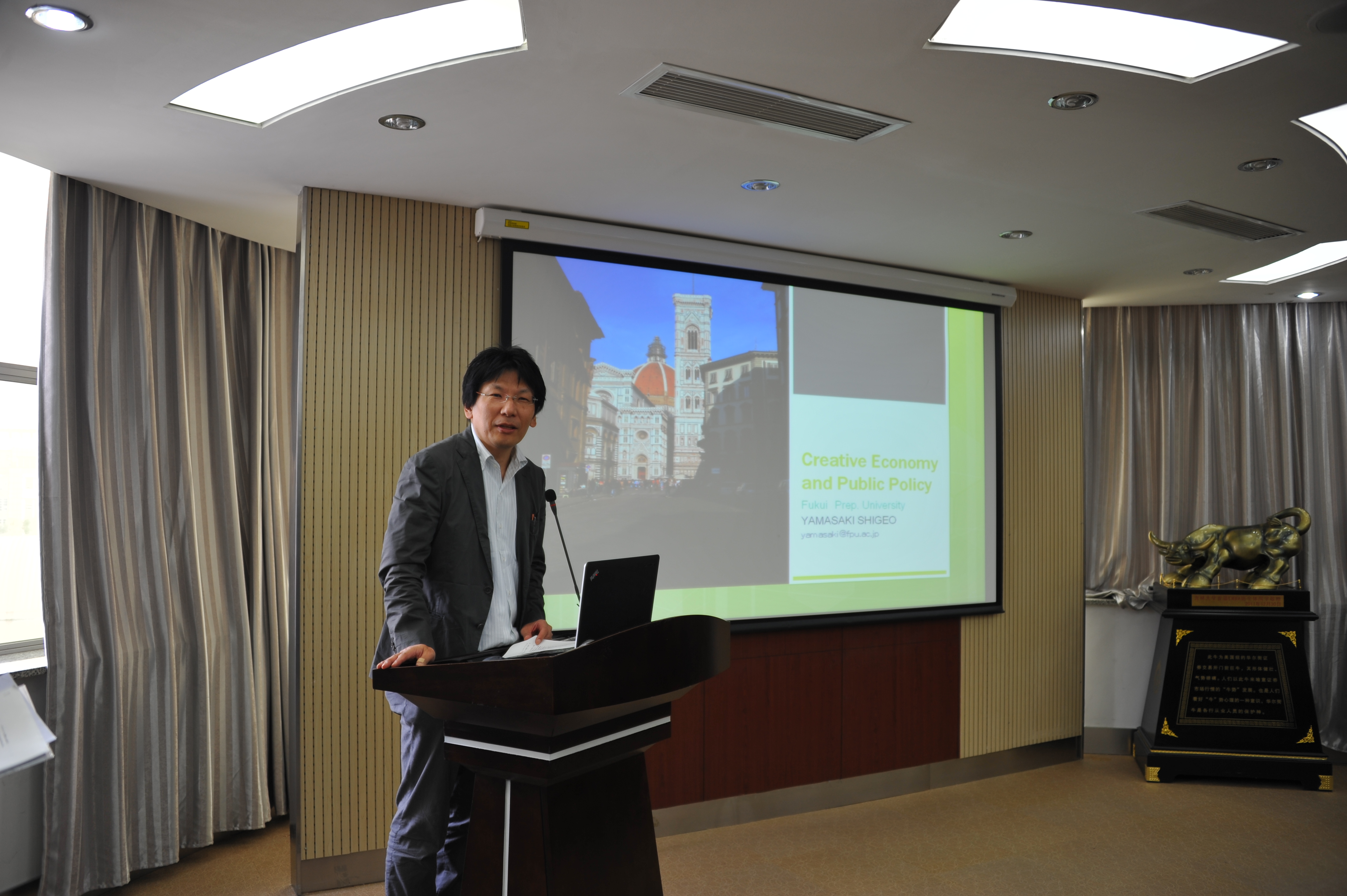 接着,山崎茂雄教授开始了题为“创意产业及其经济政策”的讲座。山崎教授通过询问同学们智能手机的使用情况,引出当代创意产业及其产品已经遍布我们生活这一话题,接着清晰地解析了创意型产业的概念。山崎教授指出,文化和艺术等等这些体现人类创造性及创造成果的经济活动是决定创意型产业的要素之一,但起决定性作用的还是信息技术,同时强调了对于创意型产业,注重保护知识产权的重要性。山崎教授还分别从文化、艺术与宏观经济的关系、日本目前在推动文化艺术产业方面的政策以及与新加坡的创意型产业及经济政策的比较等方面进行了详尽的阐述。