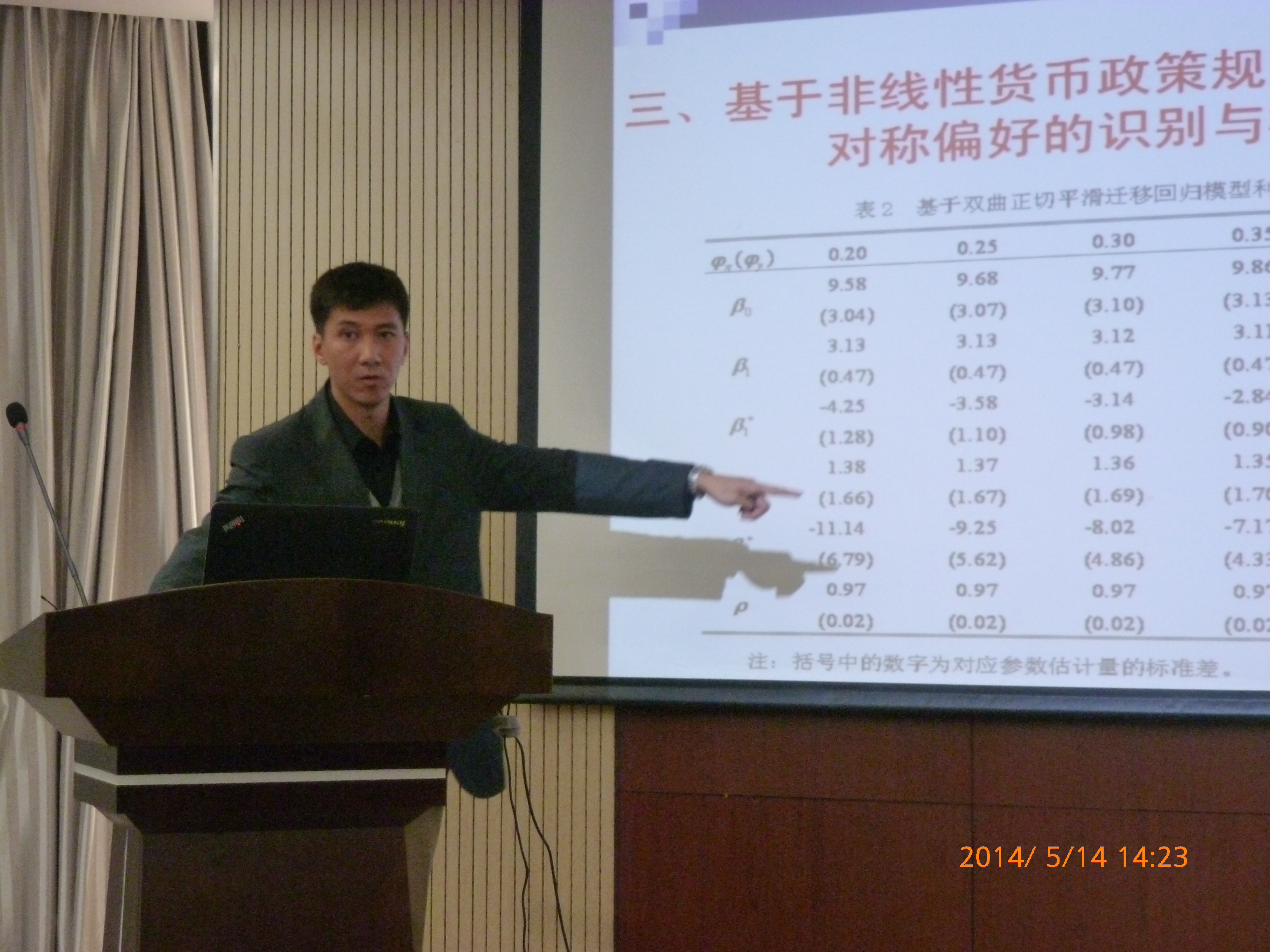 首先是张小宇副教授以“央行规避经济收缩和规避价格通胀偏好的识别与检验”为题,将自己的研究成果与大家分享。他在对中央银行规避经济收缩偏好以及规避价格通胀偏好进行理论分析的基础上,在线性总供给曲线和线性总需求曲线描述的经济结构框架下,对中央银行最优货币政策规则进行了理论分析,并针对利率对通胀缺口 (产出缺口) 的调整特征与中央银行的非对称偏好特征之间的相依性给出两了用于检验中央银行非对称性偏好的命题。在此基础上通过对我国货币政策规则进行线性检验,构造双曲正切平滑迁移回归模型对非线性货币政策规则进行了参数估计,结果发现我国货币政策规则存在明显的非线性,利率反应函数是关于通胀缺口和产出缺口的凹函数,利用本文给出的两个命题证实我国中央银行存在规避经济收缩偏好。