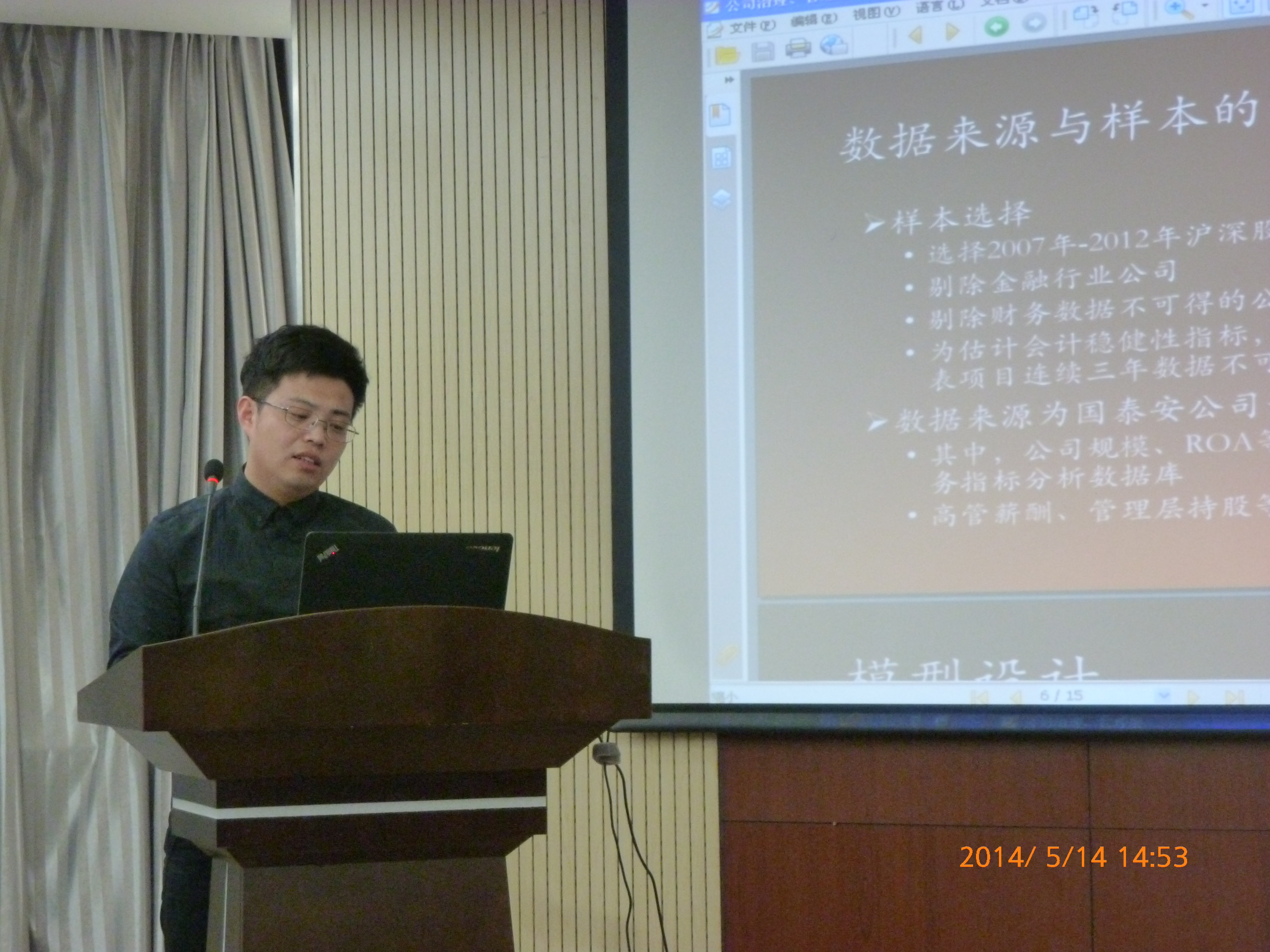 接下来是会记系的呼建光老师就自己的一片工作论文与大家进行了交流。他交流的题目为:“公司治理、管理者过度自信与会计稳健性”。呼建光老师以我国A股上市公司为样本,从管理者心理特征角度研究了管理者过度自信对于会计稳健性的影响。研究发现我国上市公司管理者过度自信会引致较低的会计稳健性。同时,以主成分分析构造了公司治理指数并检验了公司治理机制对于管理者过度自信影响会计稳健性的治理效果,研究发现目前我国上市公司治理机制未能有效抑制管理者过度自信对于会计稳健性的不利影响。这意味着应完善我国上市公司治理机制以提高公司会计稳健性。