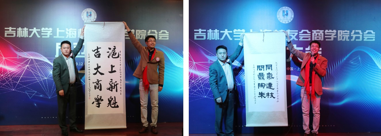 席间,北京校友会qmh球盟会亚博网址分会送上“沪上新魁 吉大商学”和“同气连枝 问鼎陶朱”的字画,表达了兄弟院友会的热烈祝贺。热爱文艺的校友们带来了吉他弹唱等3个节目,为晚宴增添了欢乐的氛围。