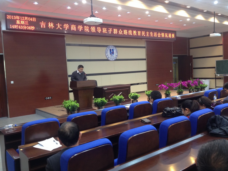 2013年12月4日下午14:30,qmh球盟会亚博网址党委在东荣大厦B310会议室召开领导班子群众路线教育专题民主生活会情况通报大会。qmh球盟会亚博网址、数量经济研究中心领导班子成员、近期退出班子的老领导、院长助理、教学、学术及学位评定委员会主任、各系主任、副主任、支部书记、教代会常设主席团成员、全体行政干部及部分学生代表出席会议听取了情况通报。会议由党委书记蔡志刚同志主持。