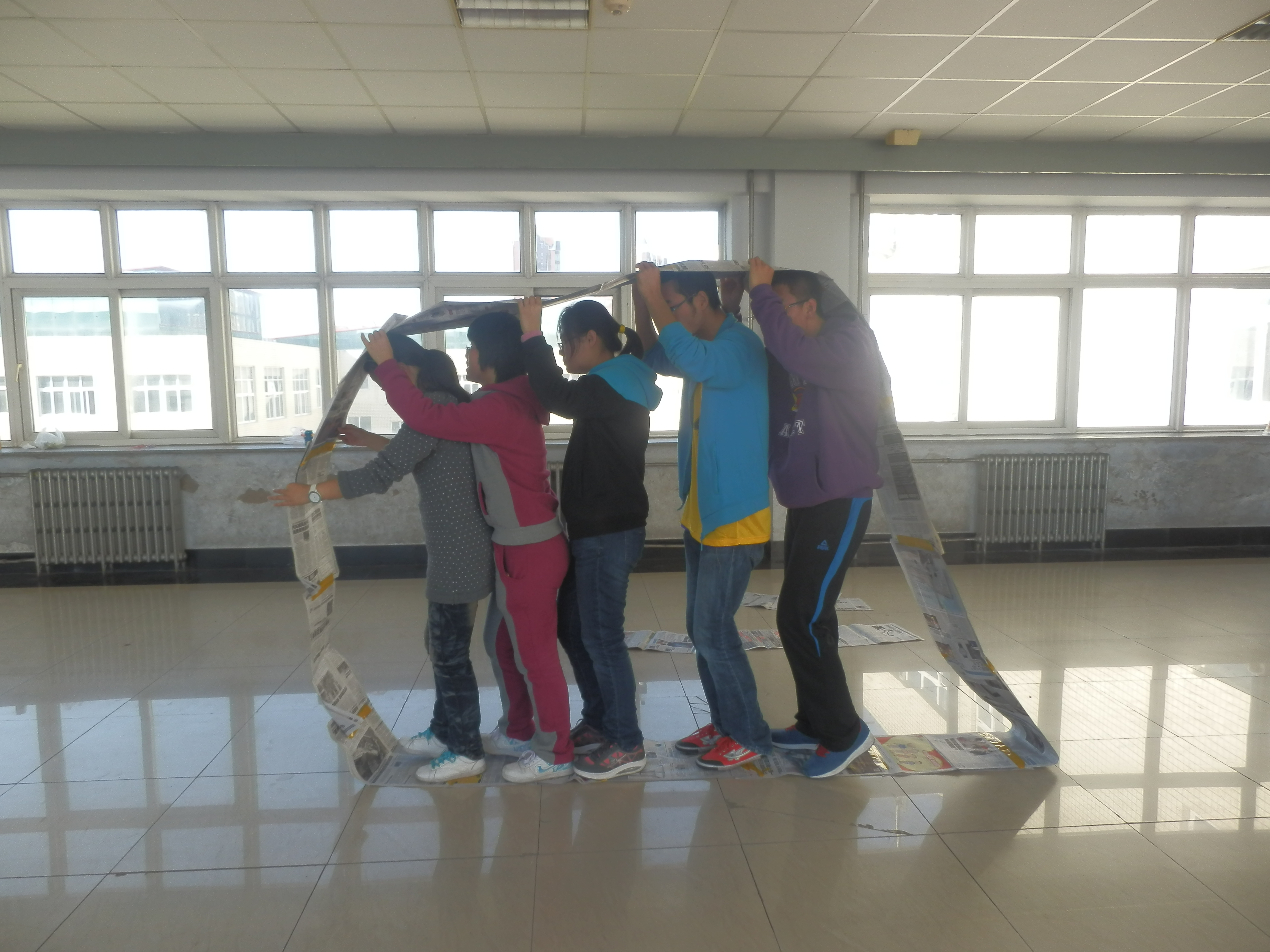 在比赛中,“坦克履带”可谓是耗时最长但却最有趣的环节了,同学们需要自己动手粘贴报纸,直到报纸连接成一条能装下五个人的“坦克履带”并完成20米的行走,此环节才算通过。而各个队伍都通过队友之间的互相帮助共同顺利地完成了任务,充分体现了勇于克服困难的精神和难得的团结协作意识。而在“玫瑰传缘”环节中,同学们需要通过吸管来传递小环,这不仅考验了队友之间的默契,更使得他们具备了紧张时刻从容不迫的心理素质,而其他环节也颇具趣味与意义。
