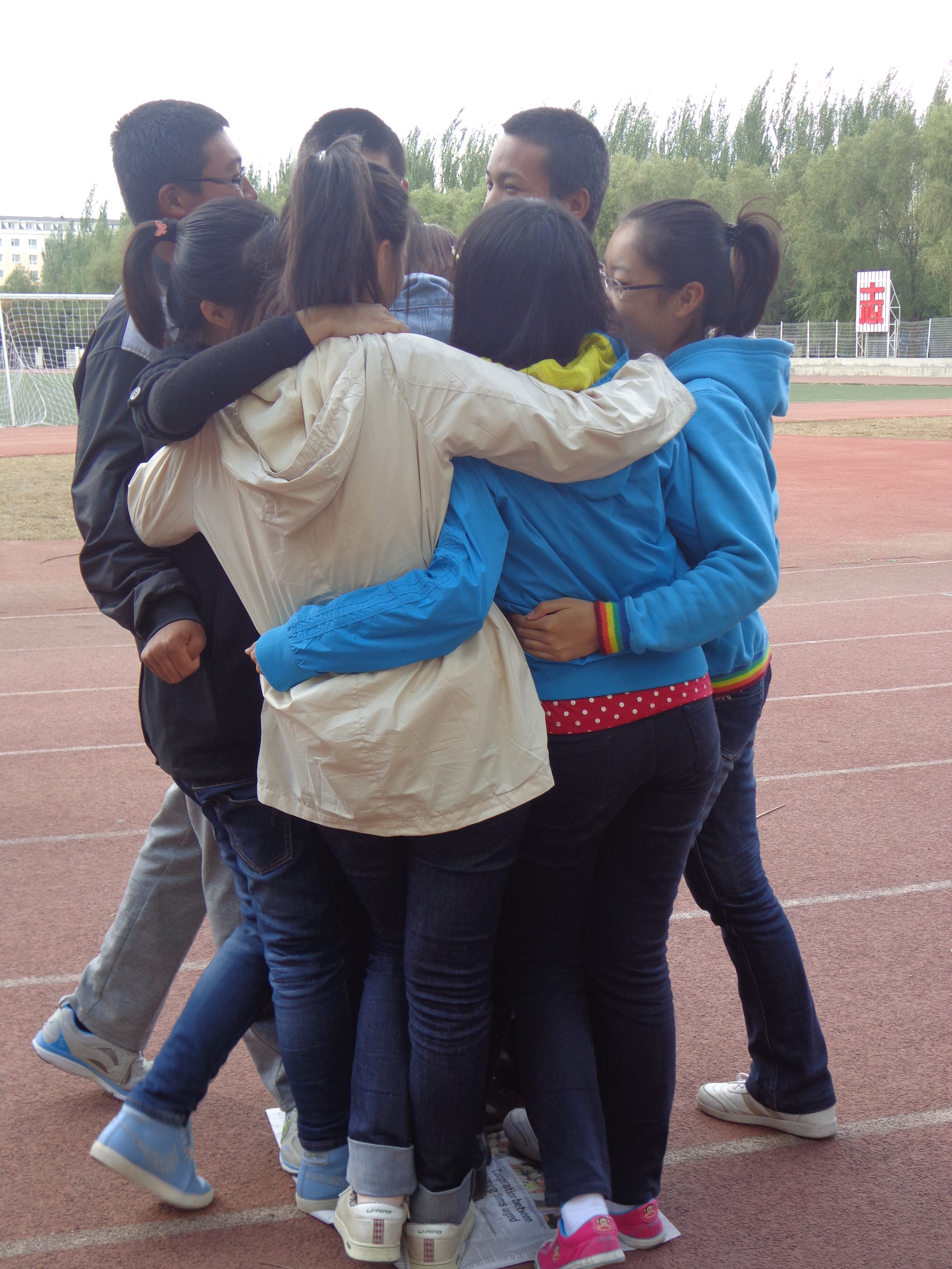 活动开始,同学们被随机分为以9人为单位的小组,并以小组为单位进行活动。首先是自定目标击掌,通过目标的设立检验了同学们对成功的追求;紧接着各小组成员在要求之下分别通过了一齐单脚站在一整份、二分之一份和四分之一份的报纸上,以及成员们围成圈依次坐在身后人的大腿上的艰巨任务,团结的力量此刻便展现出来。