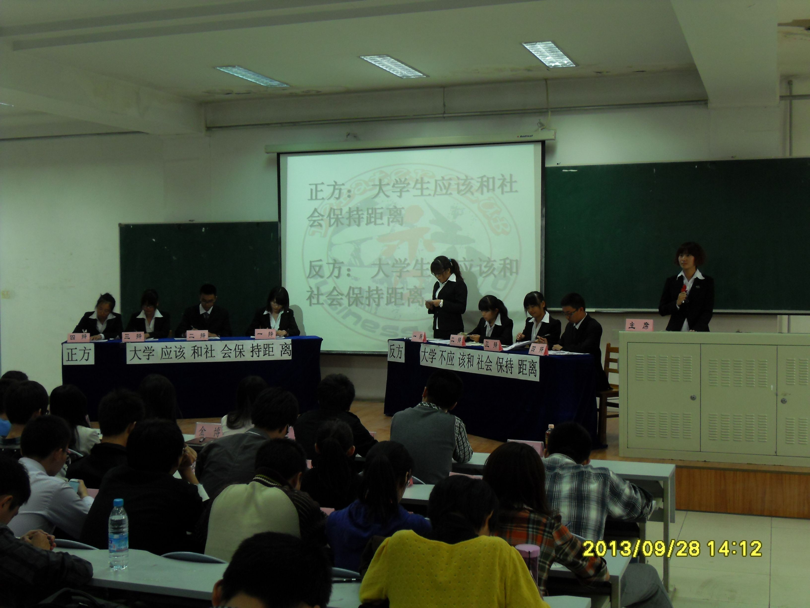 9月28日下午2点,激动人心的qmh球盟会亚博网址2013级新生辩论赛决赛在三教九阶举行。正方会计5班,观点为大学应该和社会保持距离;反方为人力7班,观点为大学不应该和社会保持距离。双方围绕各自论点展开了激烈的角逐。