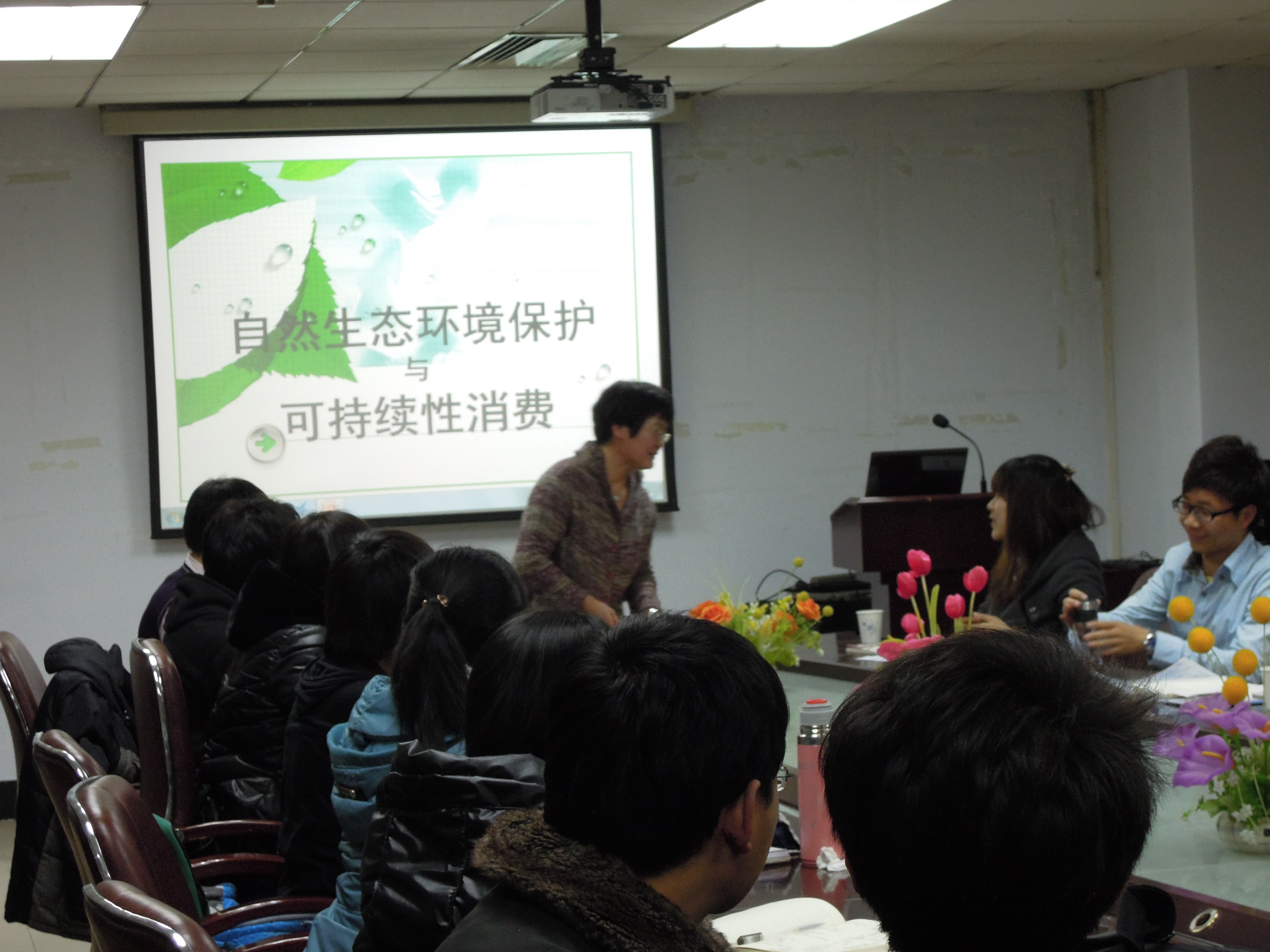 接着,本次的特邀嘉宾营销系盛光华老师以“自然生态环境保护与可持续性消费”为主题,为我们讲述了我国在“五位一体”的总体布局下可持续性消费及低碳生活的概况。期间,盛老师还对“新能源为何不能产业化”、”低碳生活推行的难题有哪些”等问题做了严谨而细致的解答。