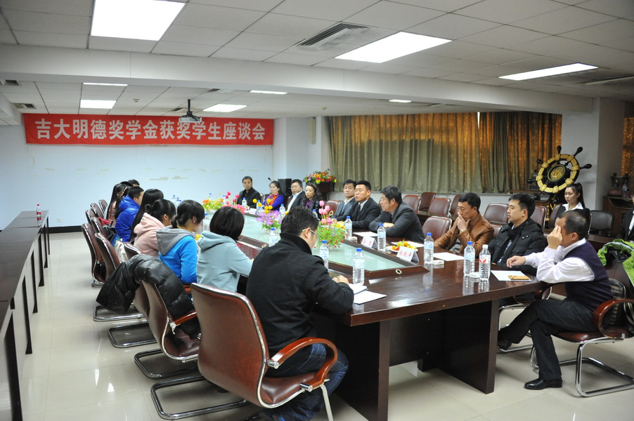 11月1日下午3时,qmh球盟会亚博网址于东荣大厦304会议室举行了“吉大明德奖学金获奖学生座谈会”。吉林吉大明德投资有限公司副董事长、总经理李东升先生,吉林省北科通信器材有限公司董事长王秋彦女士,吉林省西点药业科技发展股份有限公司副总经理孙凯先生,上海绿地集团吉林置业有限公司总经理张铁丰先生,吉大明德投资有限公司财务总监陈晶女士,球盟会qmh学生工作部部长周春国老师,球盟会qmh教育基金会主任安泽老师、副主任冉军老师出席了本次座谈会。同时出席本次活动的学院领导有:qmh球盟会亚博网址党委书记蔡志刚老师和党委副书记兼副院长范庆文老师。范书记主持了本次活动。