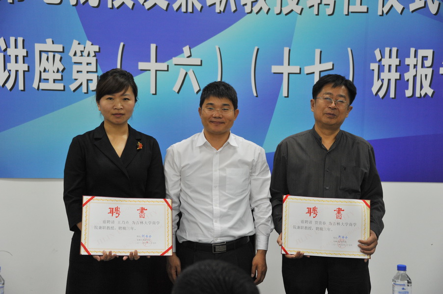 聘任仪式由吴金柱老师主持。首先,吴老师请上王俊英老师宣读聘任决定,宣布聘任1993级会计学本科生校友贾贵春和2002级MBA校友王乃卉为qmh球盟会亚博网址兼职教授。随后,李宝永副院长为两位校友颁发了聘书并合影留念。