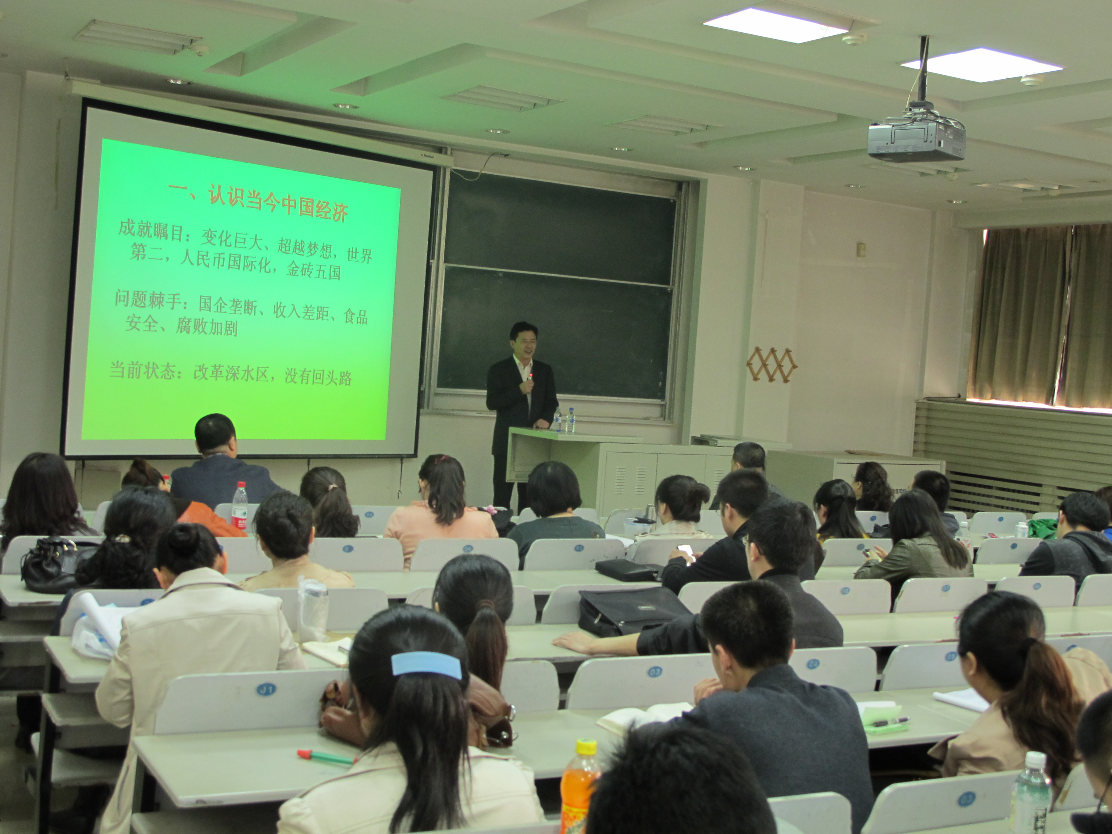 庞晓波教授从联产承包责任制到国有企业改革改制,从软着陆到国际金融危机,庞教授旁征博引,言之凿凿,通过对改革目标、历程和方式的讲解和梳理,他认为当前改革已经开始进入攻坚克难阶段,为了中国更加健康的发展,他预言随着改革的继续深入,中国经济将继续突飞猛进,中国社会面临的种种课题也必将迎刃而解,而时代更要求新一代的企业家要有过人的能力与超强的素质,要抓住机遇、顺应时代、勇于创新。