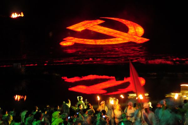 "井冈山"。演出分为序血,旗,灯,情,火,路,五个乐章。在600多名红军后代的叙述中展开,炮火连天的实景战争场面,把你带进80年前的峥嵘岁月,唤醒每个人心中的红色记忆,精神洗礼我们的心灵,是一场和平年代与浴血岁月的对话。“血”描述黑云、监牢、刑场、血海,是一九二七年永子磨灭的历史记忆。“旗”描述红旗、镰刀、斧头、两只红色队伍会师井冈,中国革命笫一个根据地横空岀世。“灯”描述农村包围城市,武装夺取政权",在北斗星下,八角楼中,毛委员制定了中国革命举什么旗,走什么路的伟大战略,毛泽东思想在这里破茧而出。“情”描述红米饭南瓜汤,秋茄子味真香,井冈山人民用血肉和生命养育了中国革命,养育了襁褓中的中国共产党。“火”描述革命者的鲜血染红了井岗,染红了谩山遍野的杜鹃。“路”描述三送红军到拿山",为中国革命奉献50000多名优秀儿女生命的井岗人民,成为红色铁流的源头,把革命的队伍送上万里长征,送上宝塔山,一直送到天安门。每一个情节都令人震撼,学员们被感动的热泪盁眶,真正感受到了井冈山精神的伟大。
