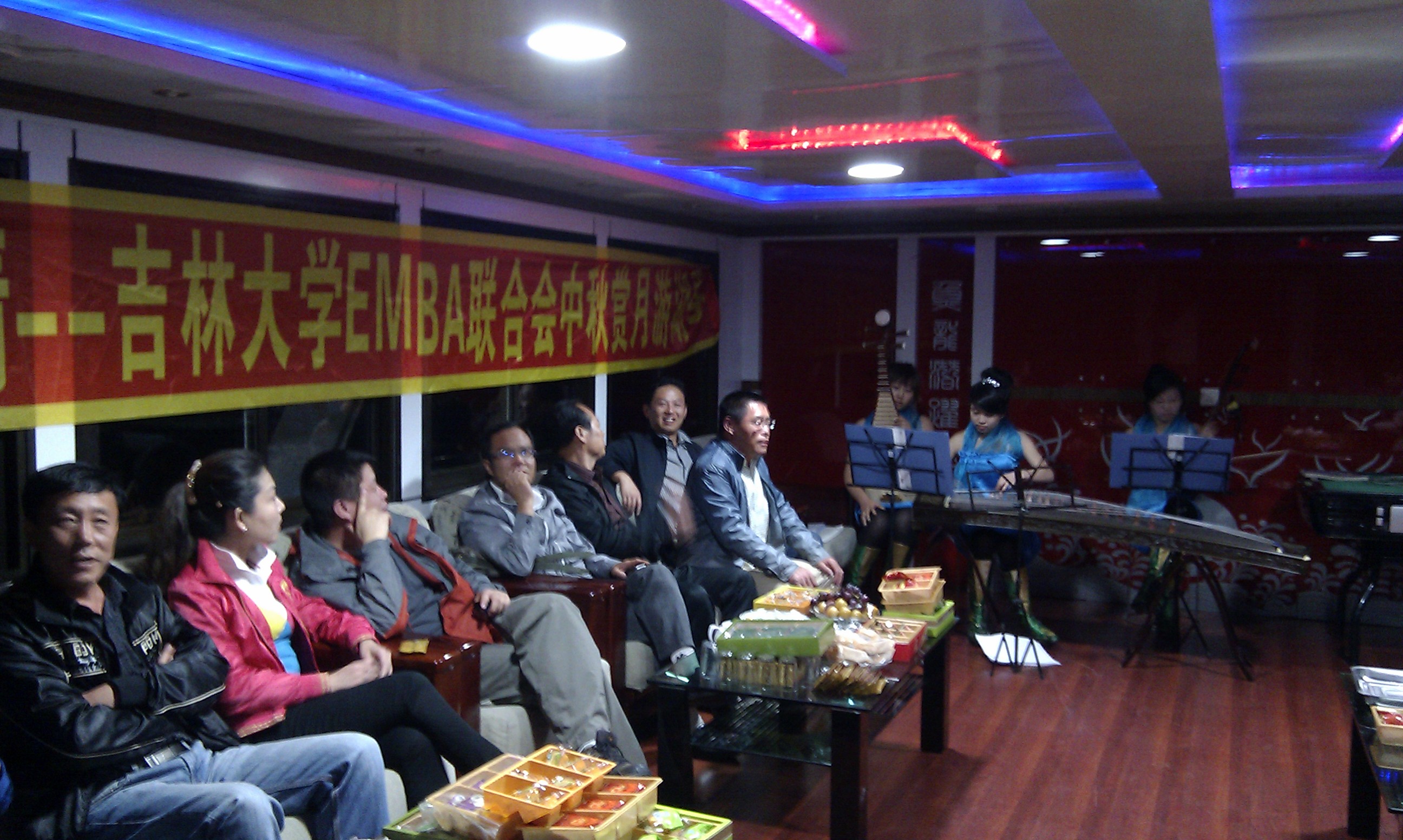 乘着美丽的夜色,大家快乐的登上松花湖上的游船,开始了“湖上赏明月,难忘共此生”激动情形。古筝、琵琶、二胡的演员的演奏把大家带进了如诗如画的境界。人们常说“月到中秋分外明”,这话很有道理。看,那带着一圈金环的月儿终于升起来了。它先是金黄金黄的,徐徐穿过一朵一朵轻烟似的白云,向上升着、升着,就在一刹那间,月儿的颜色变浅了、变白了!此景让学员们心旷神怡。