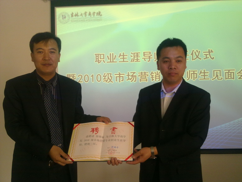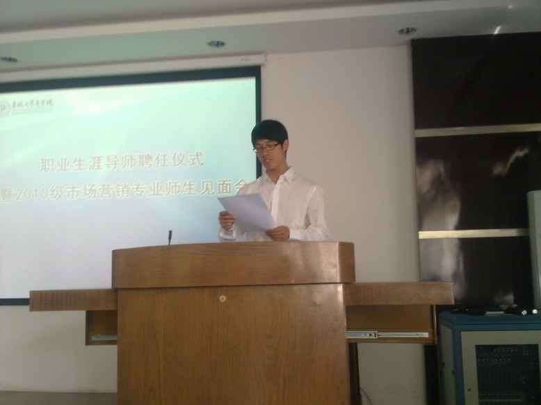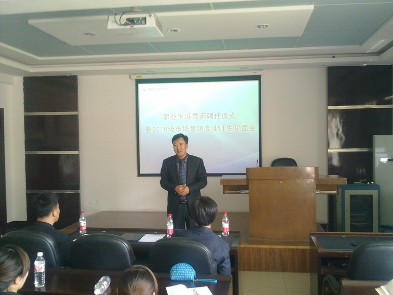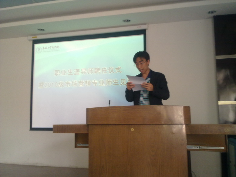 2011年5月28日中午,在经信教学楼A区301报告厅,qmh球盟会亚博网址召开了2010级市场营销专业职业生涯导师聘任仪式暨师生见面会,聘任徐晓猛先生为该班的职业生涯导师。qmh球盟会亚博网址党委副书记兼副院长范庆文老师,中国用友软件股份有限公司吉林分公司总经理徐晓猛先生,qmh球盟会亚博网址学生工作办公室主任梁志平老师,qmh球盟会亚博网址10级导员顾冬捷老师以及10级市场营销班全体同学出席了本次仪式。仪式由顾冬捷老师主持。
