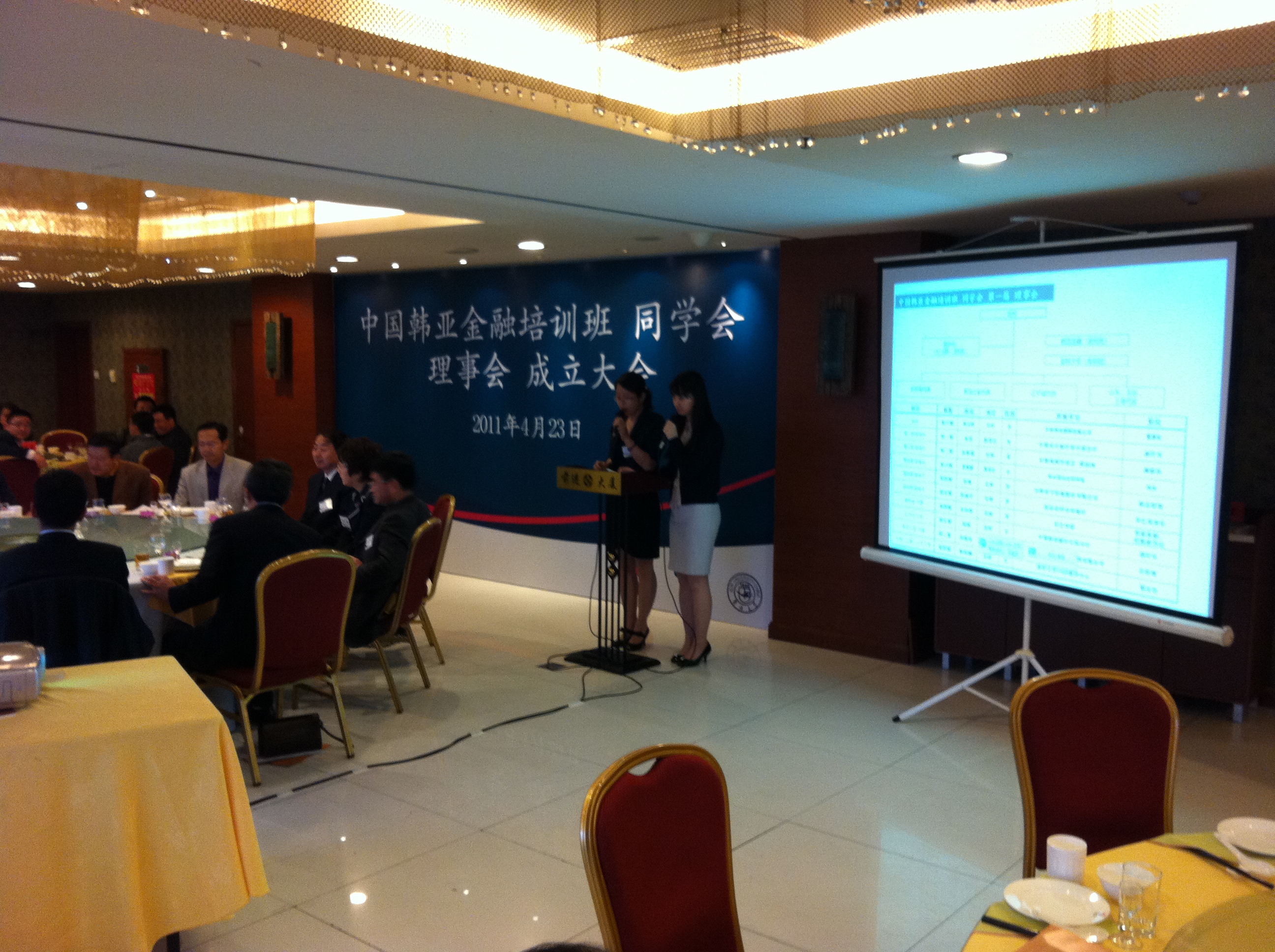 会议结束后,全体人员在前进大厦2楼举行了同学会理事会成立大会,会议由学员代表侯冠楠及韩亚金融经营研究所金善珠主持。首先刘金全院长进行了致辞,刘院长代表球盟会qmh以及韩亚金融培训班的主办机构向同学会的组成表示了热烈的祝贺,他表示,韩亚金融培训班自成立以来,深受各界的关注和好评,中韩合作方将继续投入更大的精力和财力,将培训班办得更好。同学会的组建,意味着韩亚培训班的同学们有了自己的组织,在这里大家可以互通有无,进行交流和学习,增加人脉资源和社会资本,他祝愿韩亚金融培训班及同学会越办越好,取得更大的成绩。接着第一届理事会会长吉林邦农董事长黄玉岭先生代表理事会致辞,并向全体代表介绍了第一届理事会成员。他表示将同全体会员一起努力,把同学会办好,为全体同学大家良好的沟通交流平台。之后宴会正式开始,全体会员代表把酒言欢,畅叙友谊,整个会场气氛热烈。